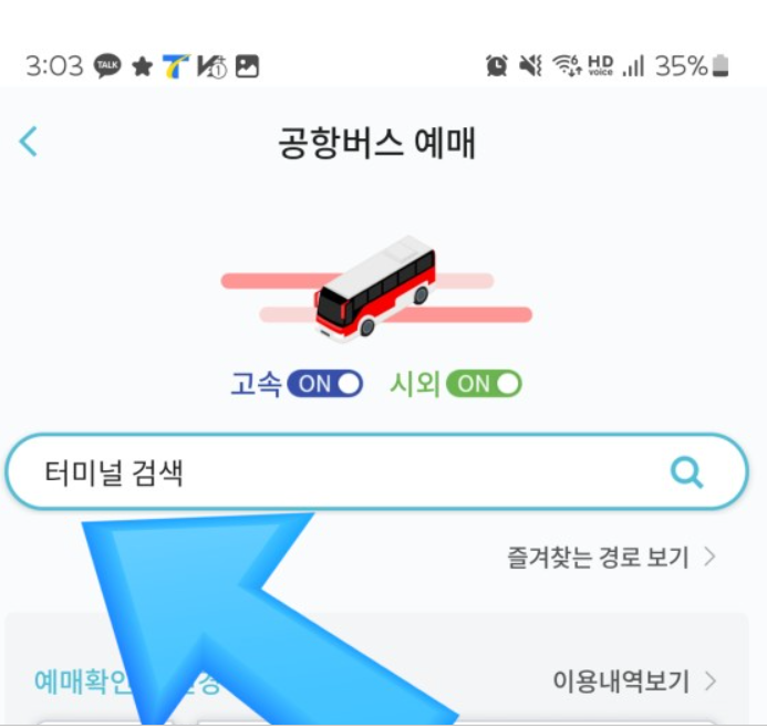 터미널 검색을 하고 출발지와 도착지 검색을 하고