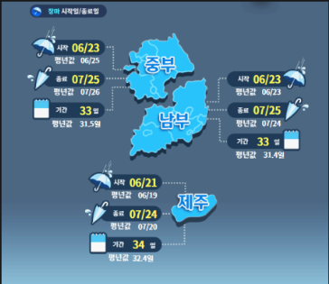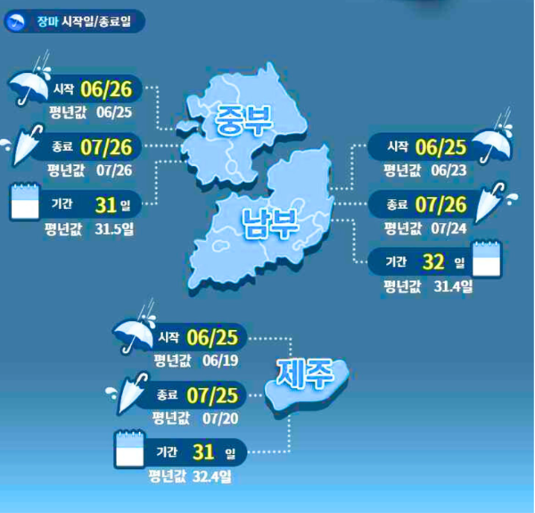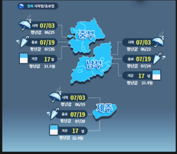 우리나라의 경우에는 보통 6월하순부터 7월 하순까지 장마기간입니다.